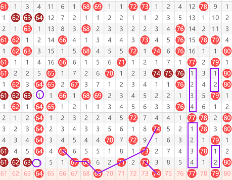 快乐8第2026018期61-80区域的推荐如上图,最后一个区推荐推荐的第一号码是64号,大家看到它上下都是间隔一的走势,同时旁边都有一个63,很有可能对称开出。然后就是69号,他有一个吊脚的斜连走势,以及73间隔一开出71,再间隔一开出69的一个走势,然后就是74号。再往后就是77号的上下对称,79号的上下对称。