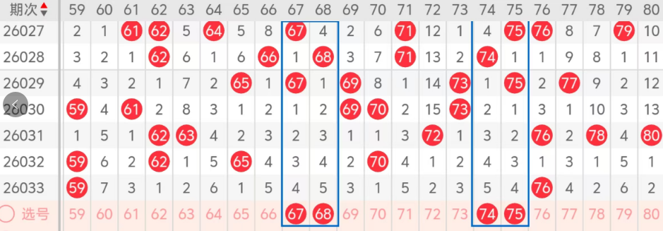 第四区间的走势分析:第四区间上期开出了一个号码球,主要的落号点位在四区间的后半区,走出了一偶的形态走势,上期四区间的前半区没有号码球落下,后半区落下了一个号码球,整个四区间处于走冷的趋势,根据四区间的走势规律,今天的四区间我们主看前半区67 68组合的落位,今天落下一码的机会还是很大的!再看后半区74 75姊妹对号码的落位,落下一码的机会还是有的这几个号码球的落位,两组姊妹对号码的走出了对称的形态,这四个号球建议大家打个四胆拖,或者打个四码复三比较稳妥,参考为主!