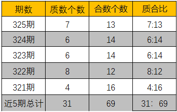 本期观点:合数在过去五期持续主导(69个)。尽管质数在322期有所回补,但近期整体仍处弱势。根据“冷热平衡”的规律,本期可继续关注质数的回补。