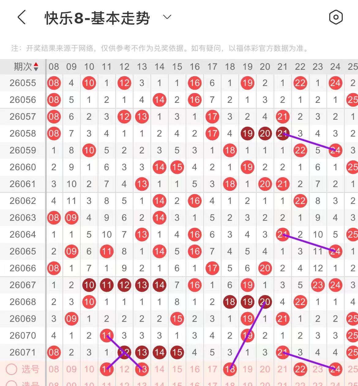 21-30区:本区间上期开出了三个号码,从号码走势图上看,该区现属于温号区,号码走势走热趋势在蠢蠢欲动,本期出号个数在三个号码左右,有出号走势的号码有22号,做为边号开出,24号,21对应24出号走势,28.30号,做分边出号考虑。