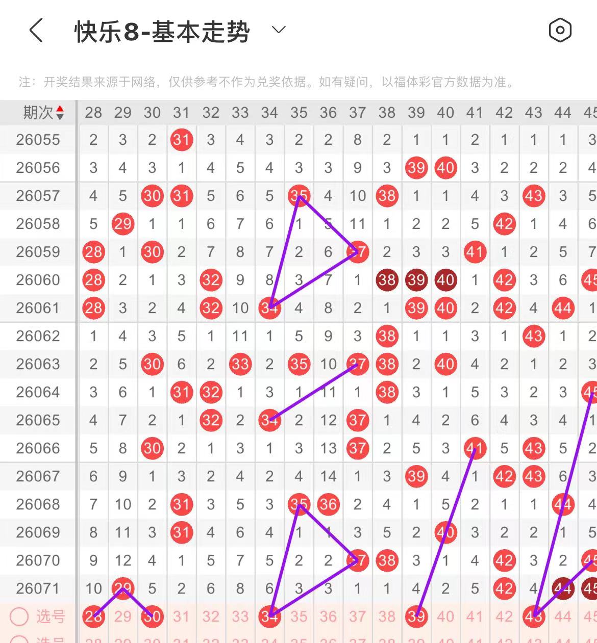 31-40区:本区间上期断区了,从号码走势图上看,该区现属于冷号区,不过,连续断区的可能性不大,本期出号个数在一两个号码之间。有出号走势的号码有34号,37对应34出号走势,39号,斜连出号走势。
