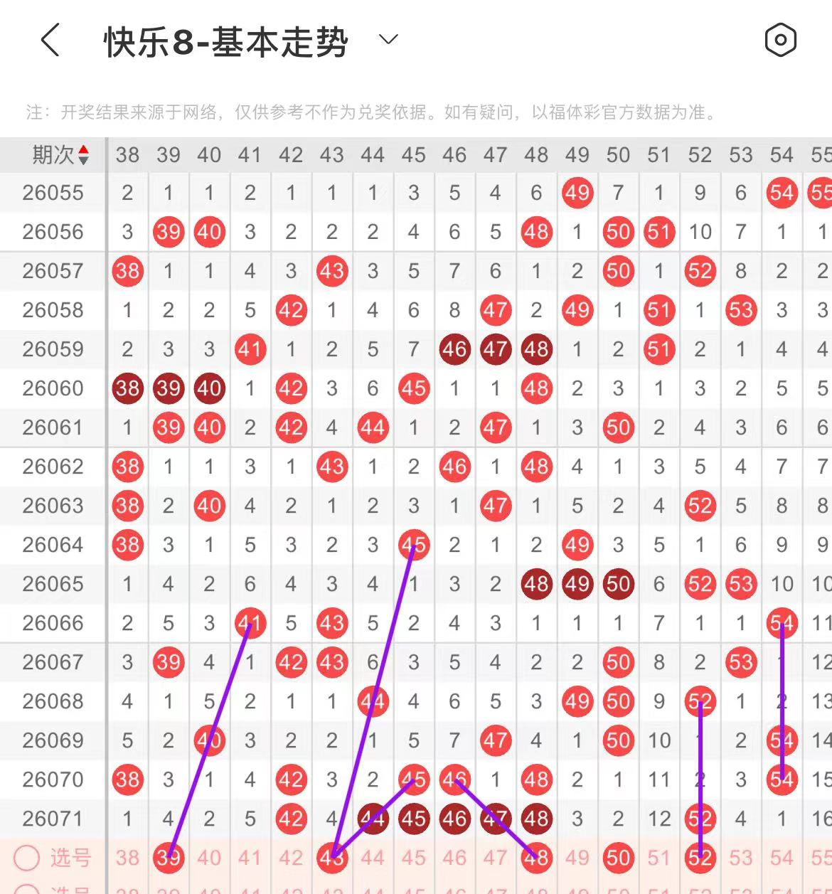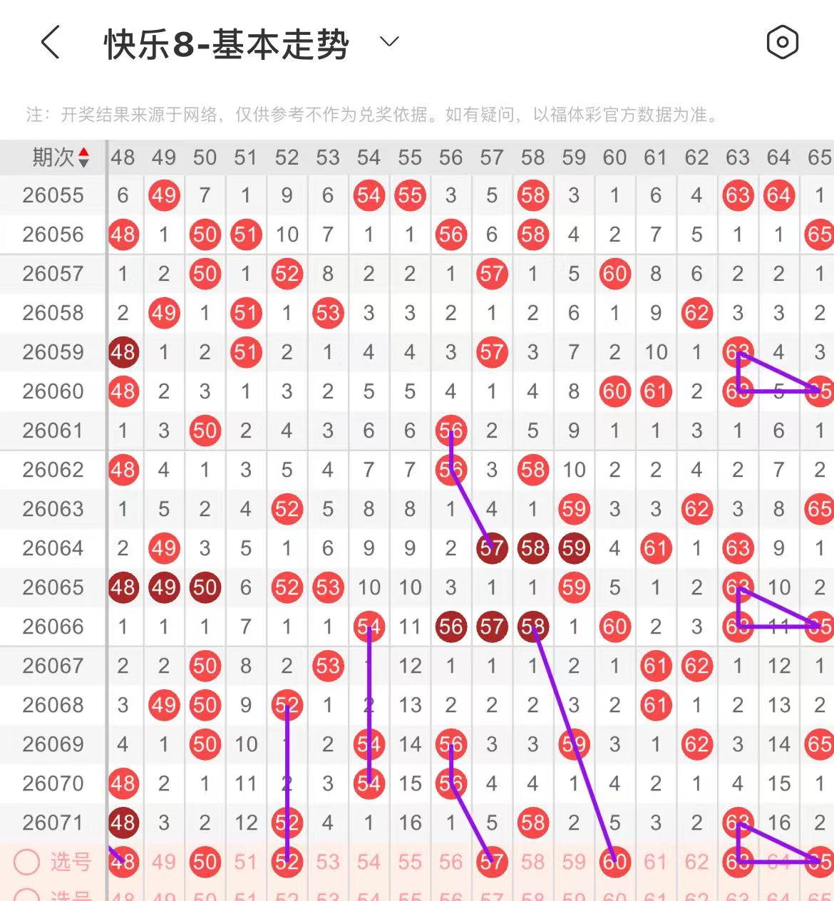 51-60区:本区间上期开出了两个号码,从号码走势图上看,该区现属于温号区,号码分边比较零散,出号个数在两三个号码之间,有出号走势的号码有52号,走重,复制54形态出号,57号,做为边号开出,60号,双线斜连出号走势。
