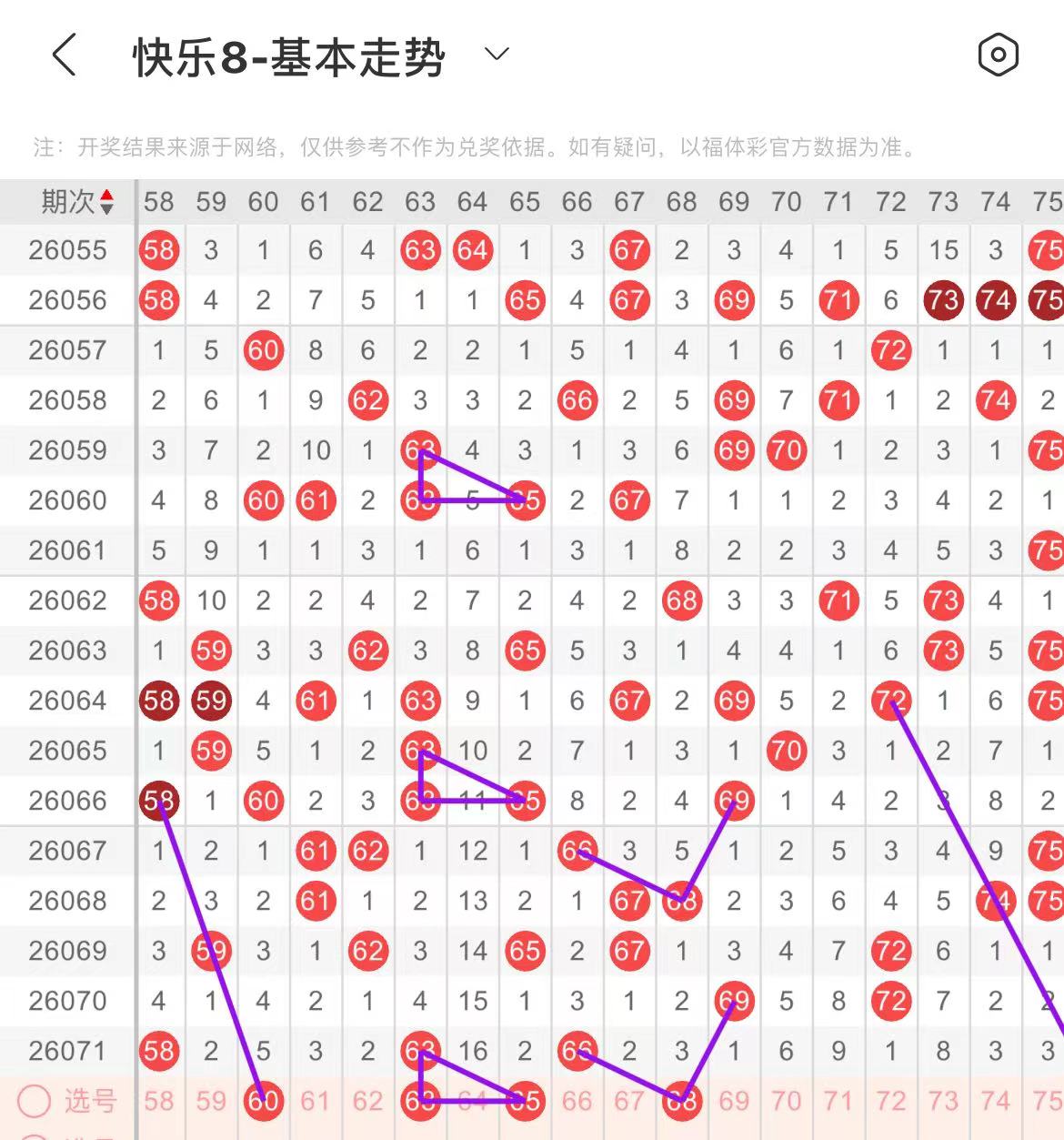 61-70区:本区间上期开出了两个号码,从号码走势图上看,该区出号个数出现逐渐提增趋势,本期出号个数在三个号码或者以上,有出号走势的的号码有63.65号,形成一个三角走势形态,68号,66对应68出号走势。