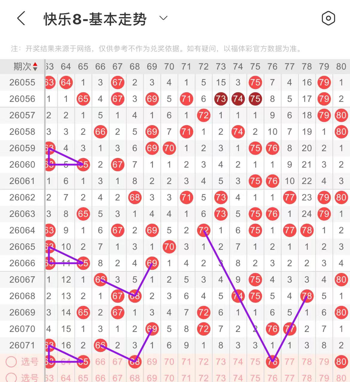71-80区:本区间上期断区了,从号码走势图上看,本期可参考的号码走势比较少,出号个数在两个号码左右,有出号走势的的号码有76号,双线斜连出号走势,防76.80同出。