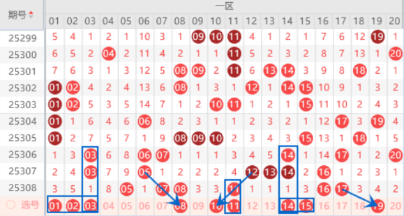 该区间01 02 03号数字本期出号机会是有的,本期可以防守一下01 03号数字或者02 03号数字同出的情况。上期开出了05 07 08 11号数字,本期我们注意一下走重的情况,其中的08 11号数字可以重点关注一下出重的情况。本期的09 10号数字我们注意落下一个号码的情况,其中的10号数字可以重点关注一下。上期的三连号12 13 14号数字没能开出重号来,本期我们注意一下出一个号码的情况,其中的13 14号数字我们可以重点关注一下。
