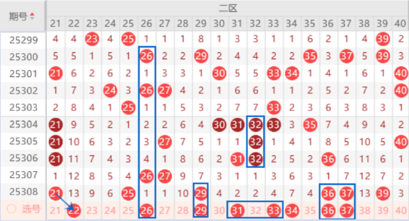 该区间的22 38号数字都是属于遗漏13期的号码,本期我们注意一下出一个号码的情况,其中的22号数字可以重点关注一下出号情况。本期的26号数字是属于141走势,出号机会是有的,我们可以关注一下出号情况。本期的31 32 33号数字是属于重号32号数字的边号回补号码,本期是有机会出一个号码的,其中的31 33号数字我们可以重点关注一下。上期开出了36 37 39号数字,本期我们注意一下出重号的情况,其中的36 37号数字可以重点关注一下。