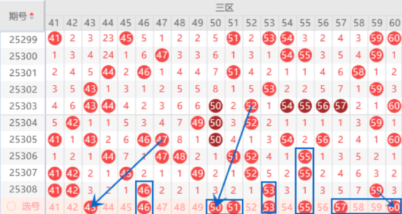 该区间的43号数字我们注意一下出号情况,属于三斜连号码,本期可以防守一下41 43号数字同出的情况。该区间上期开出了46 53 59号数字,本期我们注意一下出重号的情况,其中的46 53号数字可以重点关注一下出号情况。本期的50 51号数字我们注意一下出一个号码的情况,其中的50号数字可以重点关注一下出号情况。本期的55号数字我们注意一下出号情况,属于3221走势,本期可以防守一下55 60号数字同出的情况。