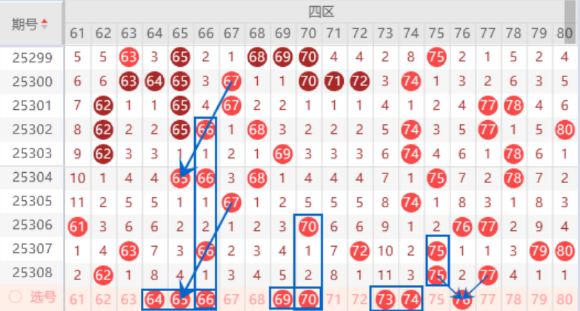 该区间的64号数字是属于回补号码,出号机会是有的,我们可以防守一下64 65号数字或者64 66号数字同出的情况。本期的65号数字是属于对应三斜连号码,出号机会也是有的,本期可以防守一下65 66号数字同出的情况。本期的69号数字我们注意一下出号情况,本期可以防守一下39 70号数字同出的情况。本期的74号数字我们注意一下出号情况,属于跟随号码,出号机会是有的,本期可以防守一下74 76号数字或者74 78号数字同出的情况。