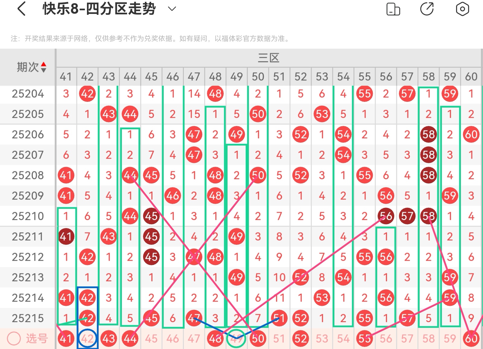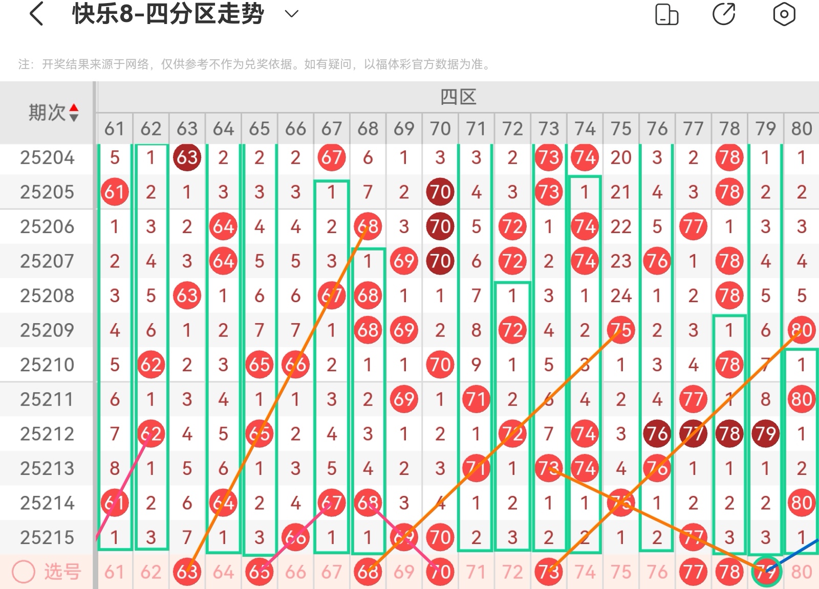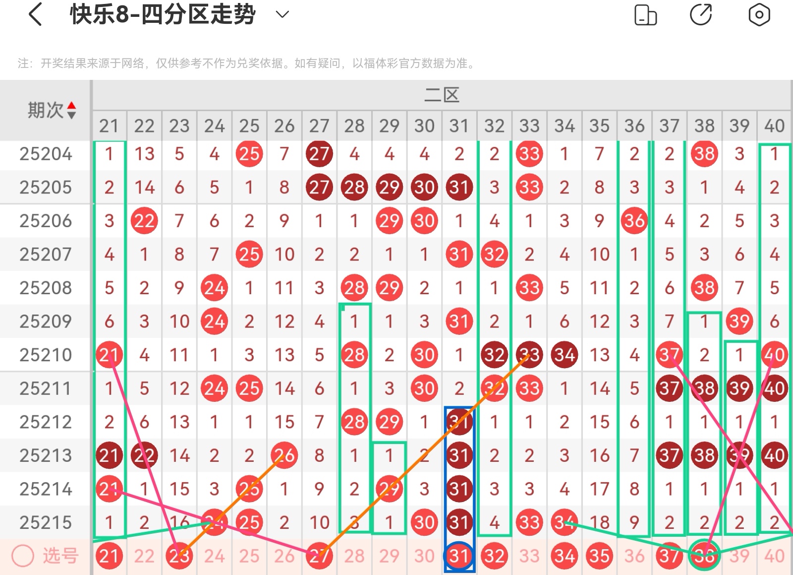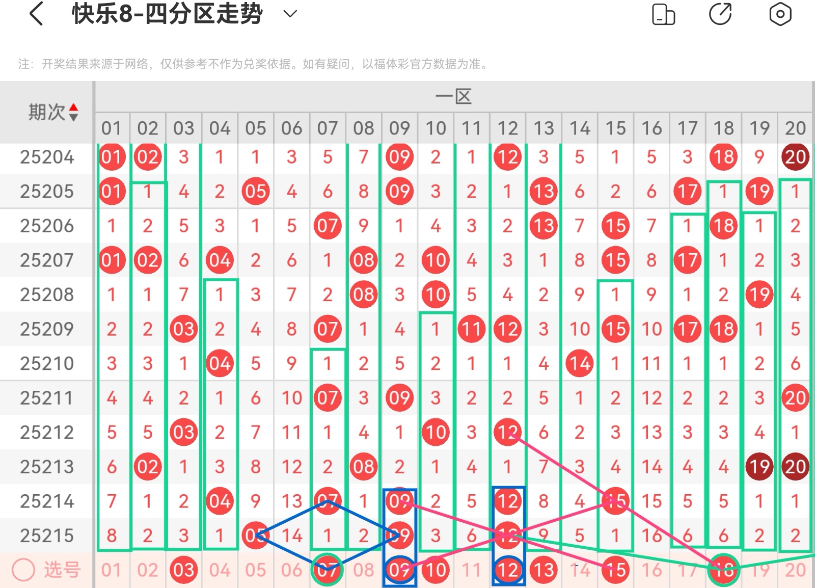 大家好,我是甜丝丝的坏事,主要以快乐八的形态走势、空位走势、遗漏走势以及斜连走势相结合的方法,用公认的四分区走势来进行预测分析,希望能让你有所收获。