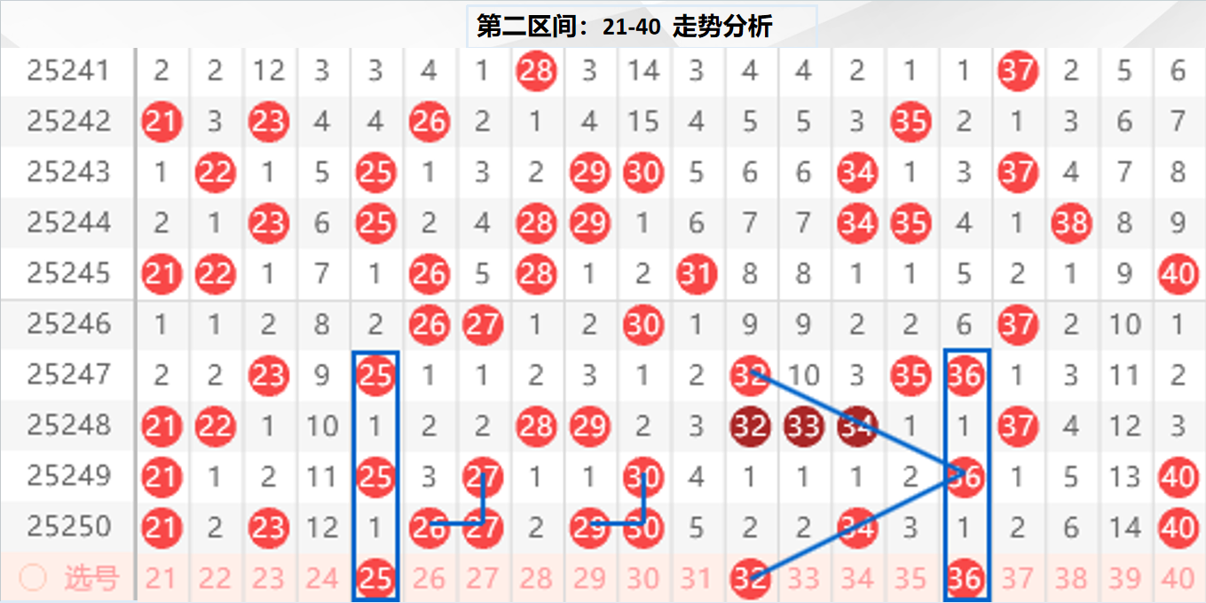 二区分析:【21-40】(走势图标注号码非小黄车大底,请谨慎参考,具体思路将在直播间分享讨论)