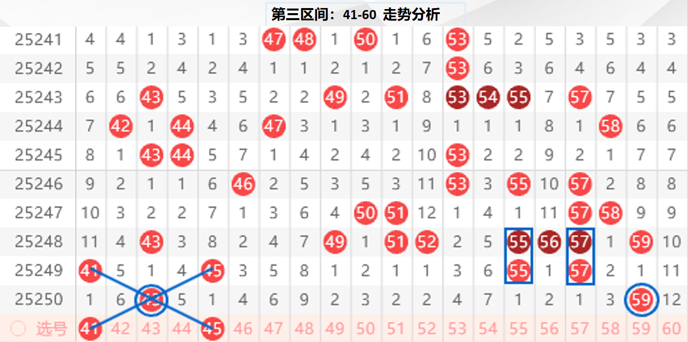 三区分析:【41-60】(走势图标注号码非小黄车大底,请谨慎参考,具体思路将在直播间分享讨论)