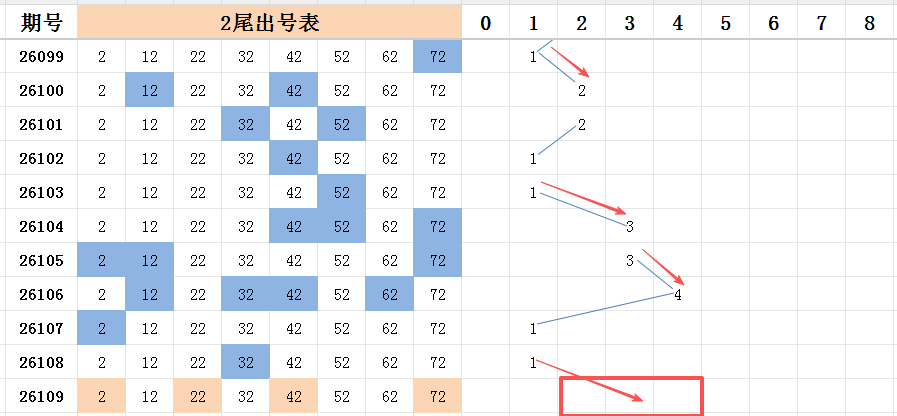 二尾上期开出一码走势,看好上期开出号码32的两个邻码:号码22和号码42,看好能够开出其中一码或者两码全开。首码看好号码02的开出,是间隔三连号的号码走势,尾码看好号码72的开出。