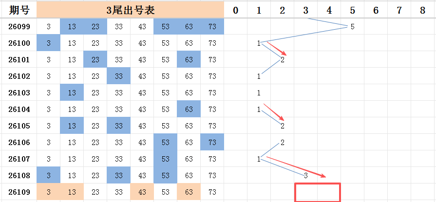 三尾上期开出三码走势,看好两个首码:号码03和号码13,能够开出其中一码或者两码全开。后半部分看好两个冷码:号码43和号码63,这两个号码所在的区间都是比较不错的区间。