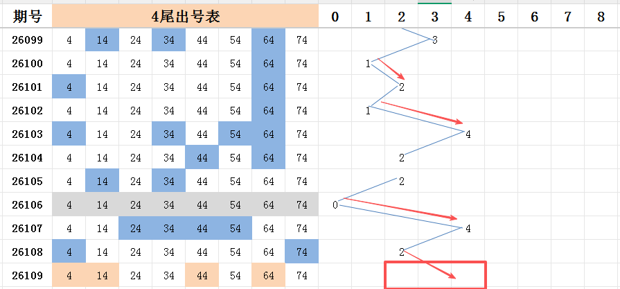 四尾上期开出两码走势,本尾主要考虑遗漏值,看好号码04走重,遗漏1期的号码看好号码44的开出,遗漏3期的号码看好号码14的开出,冷码看好号码64的开出。