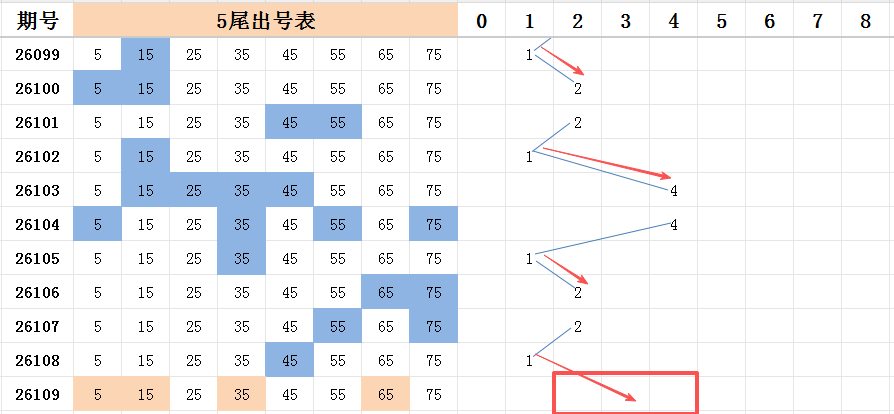 五尾上期开出一码走势,号码35是四斜连的号码走势,比较不错,搭配两个首尾中的任意一个都可以。