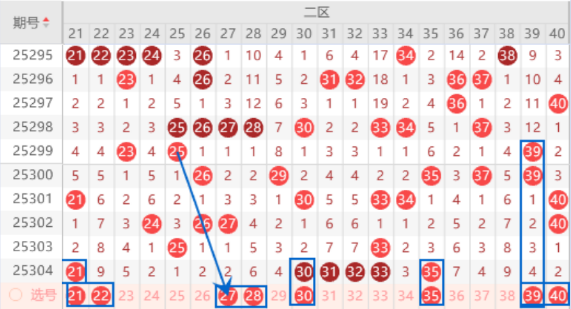 该区间的22号数字本期我们注意一下出一个号码的情况,本期可以防守一下21 22号数字同出的情况。本期的24 25 26号数字有可能继续断号的,我们本期可以放弃了。本期的27 28号数字我们注意一下出号情况。上期开出了30 31 32 33号数字,本期我们注意一下出一个重号的情况,其中的30号数字可以重点关注一下出号情况。本期的39 40号数字我们注意一下出号情况,其中的40号数字可以重点关注一下出号情况。