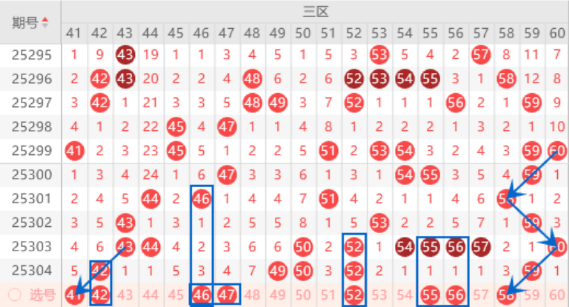 该区间的41号数字我们注意一下出号情况,属于三斜连号码,本期可以防守一下41 42号数字同出的情况。本期的47号数字我们可以重点关注一下,本期是有机会出号的,本期可以防守一下46 47号数字同出的情况。上期开出了50 52号数字的重号,本期我们注意一下出一个三重的情况,其中的52号数字可以重点关注一下。上期的四连号54 55 56 57号数字没能开出重号来,本期我们注意一下落下号码的情况,其中的55 56号数字可以重点关注一下。