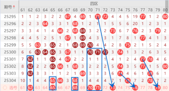 该区间61 62 63号数字是属于重号62号数字的回补号码,本期是有机会出一个号码的,我们可以关注一下。上期开出了65 66 68号数字的连号空一带号,本期是有机会出一个重号的,其中的65 68号数字可以重点关注一下出号情况。本期的70 71 72号数字我们注意一下落下一个号码的情况,其中的70 71号数字我们可以重点关注一下出号情况。本期的73 76 79号数字已经同时遗漏7期了,本期是有机会出一个号码的,本期是有机会落下号码的,我们可以重点关注一下。