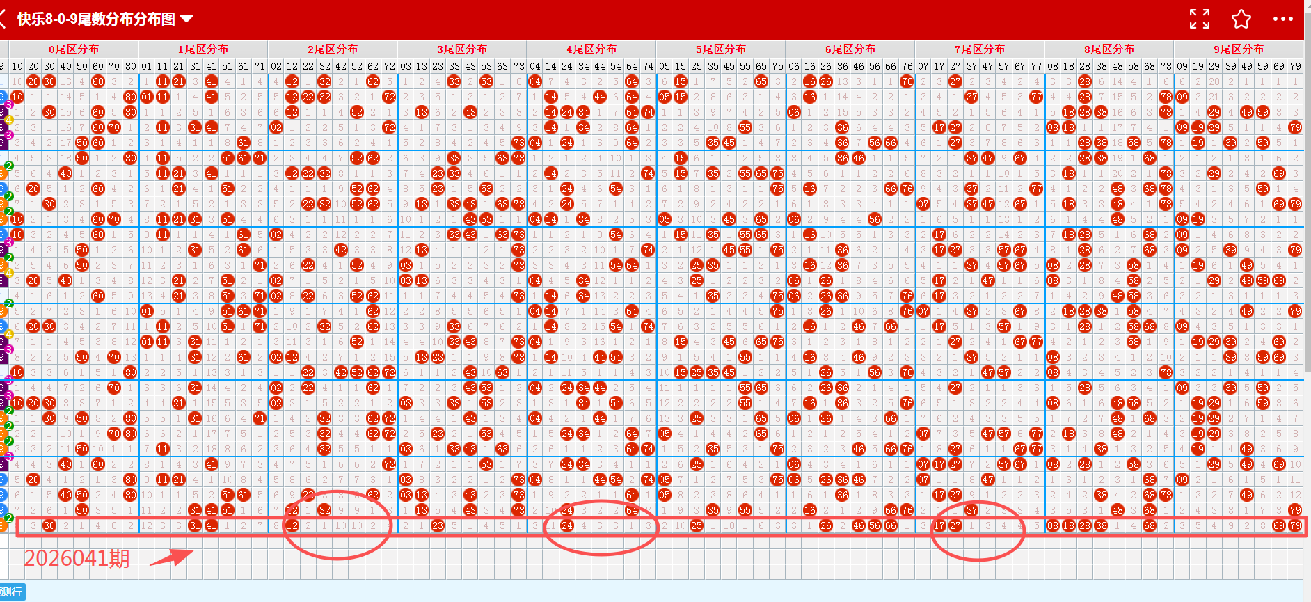 上图是快乐八2026041期的尾码走势图,从图中看0尾到9尾出号个数依次是:0尾号码区开出1个;1尾号码区开出2个;2尾号码区开出1个;3尾号码区开出1个;4尾号码区开出1个;5尾号码区开出1个;6尾号码区开出4个;7尾号码区开出2个;8尾号码区开出5个;9尾号码区开出2个;再看小尾号码(0尾-4尾)区有6码,大尾号码(5尾-9尾)有14码;数据比对统计后可以看到本期8尾出号数量最多,一共开出了5个中奖号码。本期没有尾出现断区!由走势比对推断2026042期重点需要关注2、4、7尾区号码下号热度回补和落号数量增加的概率较大。