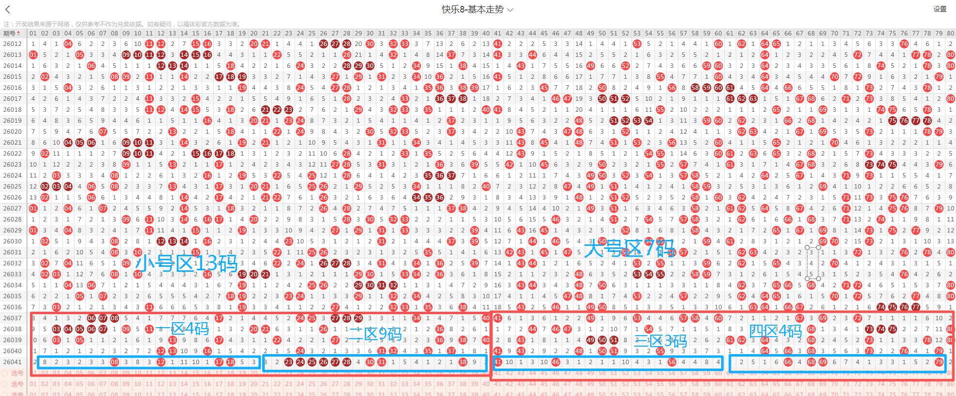 上图是快乐八2026041期区间走势图,从图中看到小号区(1-40)开出13个出奖号码,从开出数量上看与上期开出数量增加,热度上升温,从小号区近10期出号情况看,整体小号区前区近期偏温趋势;大号区(41-80)本期开出了7个出奖号码,从开出数量上看与上期开出数量减少,热度降温,从近期出奖号码个数看属于偏温态势,下期快乐八2026042期大号区号码大概率热度回温延续,大小区间主看大区号码热度回温概率较大,大小比具体区间比可参考11:9,防10:10的比例;再从细分区间来判断,按走势图四分区分成四个区间,一区(1-20)开出来的号码有4个;二区(21-40)开出来的号码有9个;三区(41-60)开出来的号码有3个 ;四区(61-80)开出来的号码有4个;数据上看本期出奖号码集中分布在二区。从号码落位区间形态上看,快乐八2026042期主看二、三区热度回暖的态势,落号几率较大,建议密切关注。