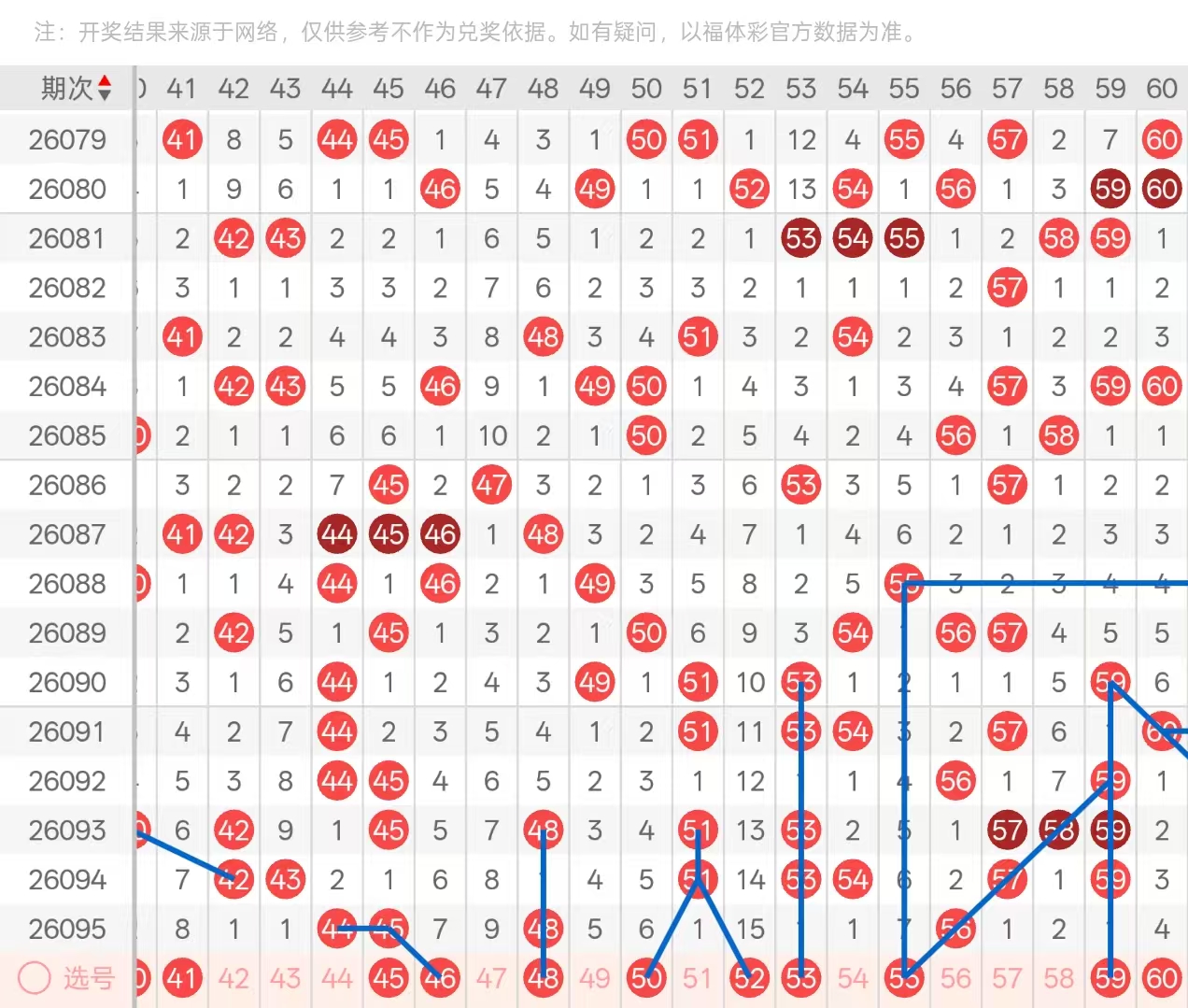 三区:三区间上期开出四码,七字头头部位置开出三重空二回补的44,与空一回补的的45以对子形态开出,尾部位置则开出孤码的48下落。五字头则仅仅开出中部位置的空二等距的56,前后部分均处于放空状态。本期四字头头部位置关注42的双重分边41-43下落一码,其次44-45对子分边考虑46的七期遗漏下落,以及48孤码防守做重,尾部位置49-50两码考虑二选一即可。五字头头部位置51-53两码重空一下落二选一即可,以及尾部位置的三重59空一回补也需要重点开出,四期遗漏的60关注一下即可。