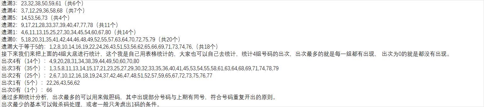 如果把对数和补数合起来有40个号码,中间可能还会产生一下重复数,通过近几期的统计分析,以上期数据进行补数对数计算推算下一期的概率不高。为提高概率,我主要是用前两期的数据来进行对数补数推算,然后再组成一个集合,作为我的第四组大底号码。