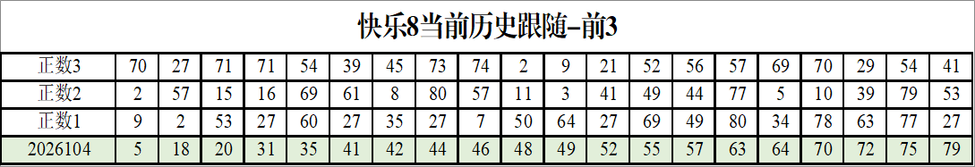 我感觉选热的同时,还要注意防冷条件开出,可以直接选取每个号码跟随出次前三的号码,也可以考虑把出次最后的三个数字加进去,不过这样可能号码太多,可以尝试。图上也能看出单独号码跟随的情况,我就不一一统计每个号码的出次了,我这里考虑提高概率,取每个号码历史跟随的前三号码和后三号码,根据2026104期的号码,我关注正数3和倒数3的号码号码为: