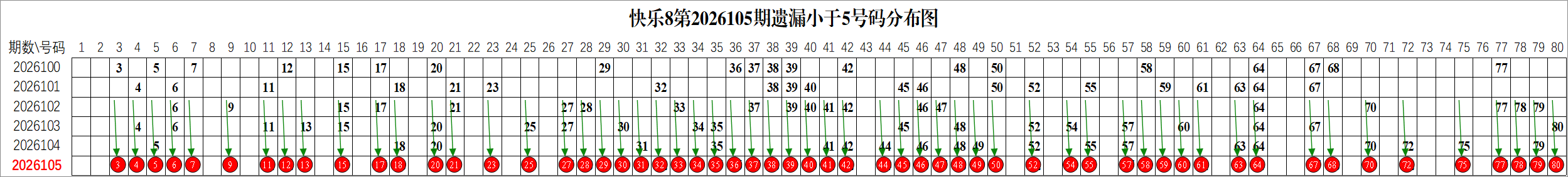 所以这个条件值得关注,从号码分布图上我们可以分析出,遗漏小于5期的号码有: