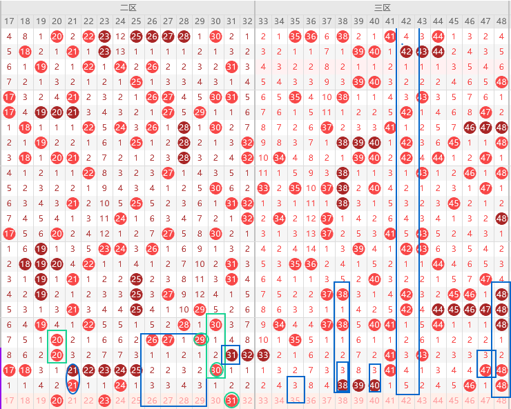 三区胆尾8尾4尾,本期热尾看好4-6码,边号37 41 45 47出一码,重号38 39 40 46 48出一码,8尾最热,选号小技巧,在热区跟热尾,8尾最热48 38出一,38出重号或者48出三重概率一样,本期3开头号多优先38,看上图42勾画,42到最大遗漏值,今天不出就是明天出,这个号可以重点关注,遗漏值隔3期号出多期,本期只有35是隔3期号,上图已勾画,47是梅花形态跟上面二期一模一样,完全复制,47是大明号,本期37 47二出一,4尾上期没回补,本期加大概率34 44二出一,有概率33 34 35三连号,结论关注六码34 37 38 41 42 48防33, 一胆38 双胆34 38