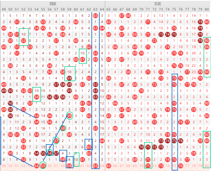 四区胆尾9尾8尾,边号51 53  57 59 60 63,重号如果回补52 58 61三出一,优先52 58,看上图勾画遗漏值隔4期号出3期,本期隔4期号只有51 59二选一,本期看好9尾,看不上59可以用49,看上图勾画,四区非常喜欢出隔10期号,喜欢冷号的今天60是唯一隔10期号,可以用,遗漏值63到最大周期,不喜欢63就选53,看上图勾画55是比较漂亮,上期这种形态56直接逮住,本期防守,2尾出4期本期防守62,结论关注五码49 51 55 59 60防63,一胆59