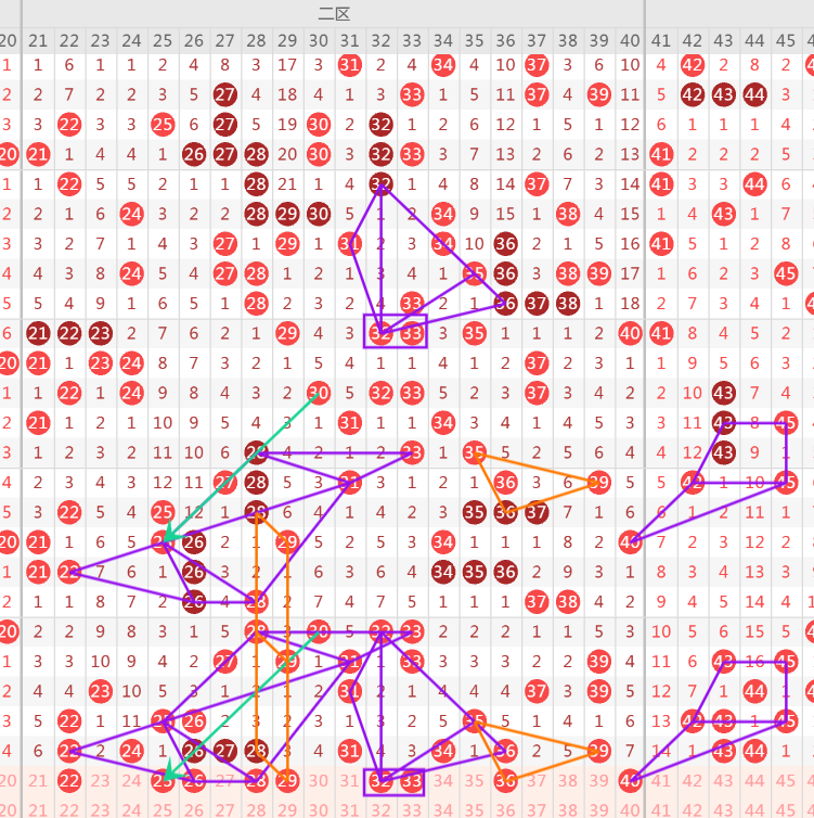 32-33:33属于斜连走势,都是分边号码,注意重点二选一.