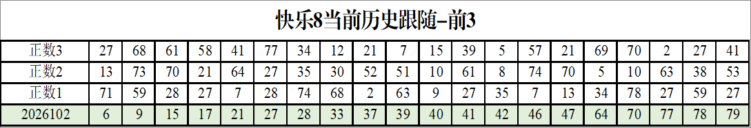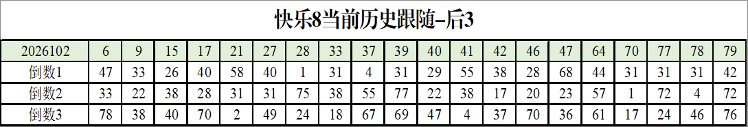 我感觉选热的同时,还要注意防冷条件开出,可以直接选取每个号码跟随出次前三的号码,也可以考虑把出次最后的三个数字加进去,不过这样可能号码太多,可以尝试。图上也能看出单独号码跟随的情况,我就不一一统计每个号码的出次了,我这里考虑提高概率,取每个号码历史跟随的前三号码和后三号码,根据2026102期的号码,我关注正数3和倒数3的号码号码为: