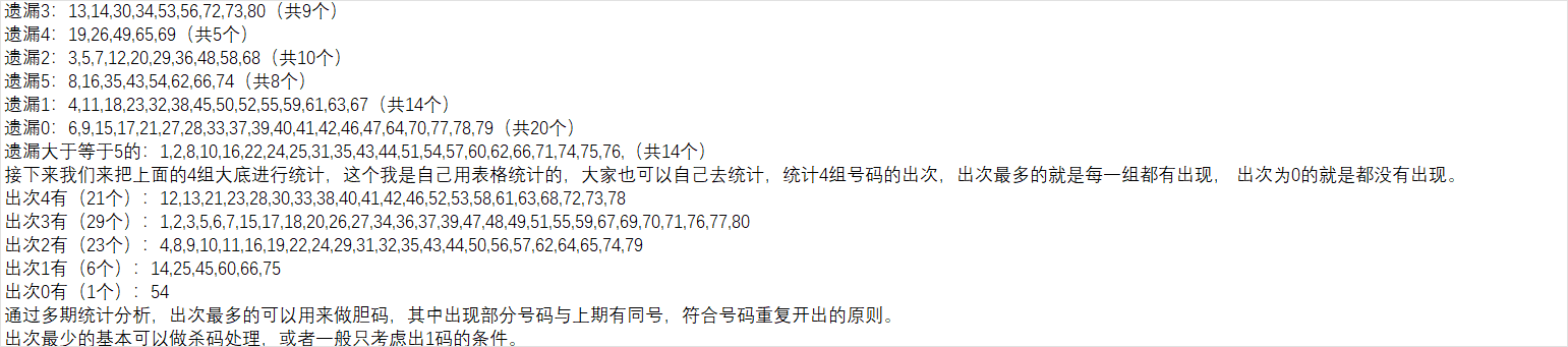 如果把对数和补数合起来有40个号码,中间可能还会产生一下重复数,通过近几期的统计分析,以上期数据进行补数对数计算推算下一期的概率不高。为提高概率,我主要是用前两期的数据来进行对数补数推算,然后再组成一个集合,作为我的第四组大底号码。