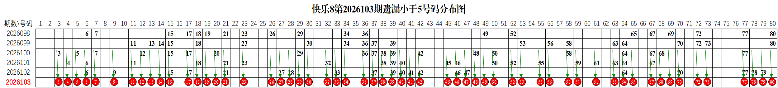 所以这个条件值得关注,从号码分布图上我们可以分析出,遗漏小于5期的号码有: