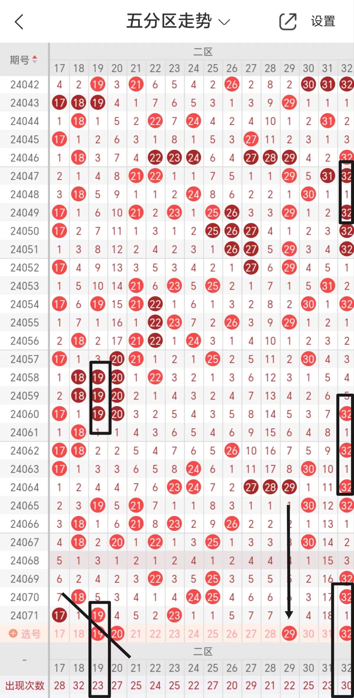 上期共开出3个号码,其中斜连码3个。近期该区间出号较冷,本期直线升温的可能性较小,但从整体出号情况看,主要出号个数集中在3个左右的变化趋势,本期考虑趋温态,开出4个号码的情况,从纵向遗漏间隔数变化看,近期出号遗漏间隔数以趋中趋小为主,本期遗漏间隔数较大号码出现的概率较大。根据号码变化趋势,本期该区间考虑4个号码,关注孤码1个(29号)、重码1个(19号)、斜连码2个(20号、32号)。
