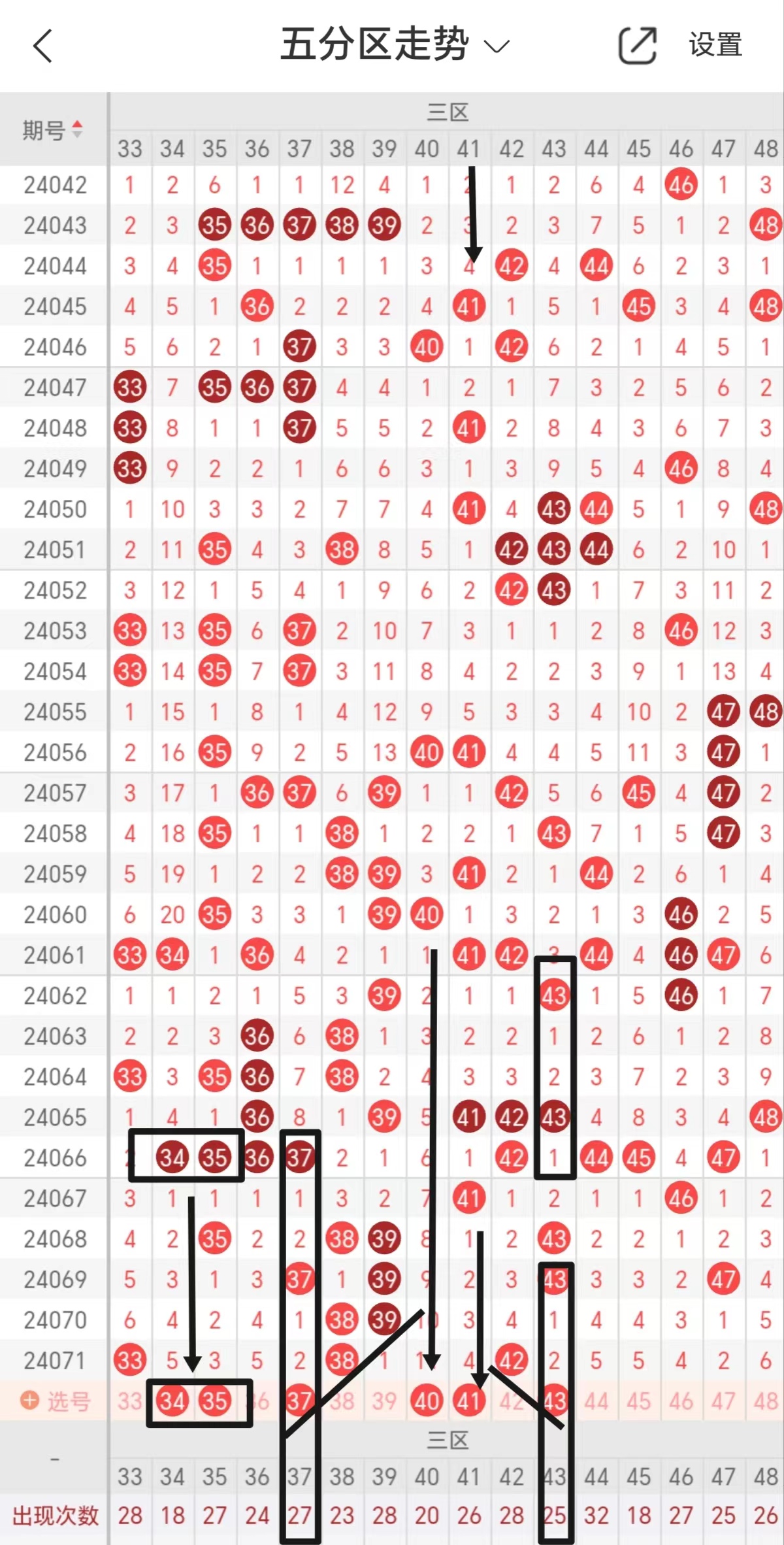 上期共开出3个号码,其中孤码1个、重码1个、斜连码1个。该区间近期出号有趋冷的形态,但考虑该区间有冷热交替出号的态势,本出号较热的可能性较大,考虑出号5个左右为宜,从三种号码形态看,近期该区间主打孤码和重码出现的形态,本期重点需考虑斜连码出现的态势,且近期斜连在整个大盘中处于较热的态势,本期斜连码出现2至4个的形态俱佳。根据出号变化趋势,本期该区间重点考虑6个号码,关注孤码2个(35号、40号)、斜连码4个(34号、37号、41号、43号)。