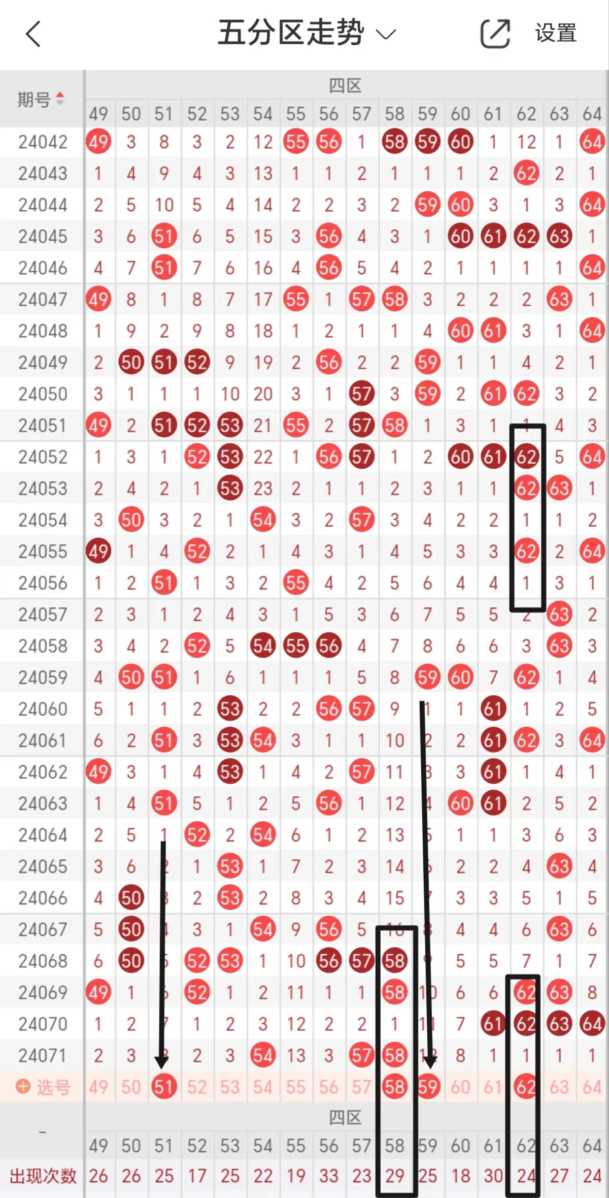 上期共开出3个号码,其中孤码3个。该区间近出号总体趋势较冷,本期出号以3个左右为主,从横向两两号码间距变化看,上期出号两两号码间距较小,本期继续追踪较小间距号码成对出号的态势,从纵向遗漏间隔数变化看,近期该区间遗漏间隔数较大号码出现的态势较好,目前该区间遗漏间隔数7期以上号码有4个,本期出现1个概率较大。根据号码趋势变化,本期该区间考虑4个号码,关注孤码2个(51号、62号)、重码1个(58号)、斜连码1个(59号)。