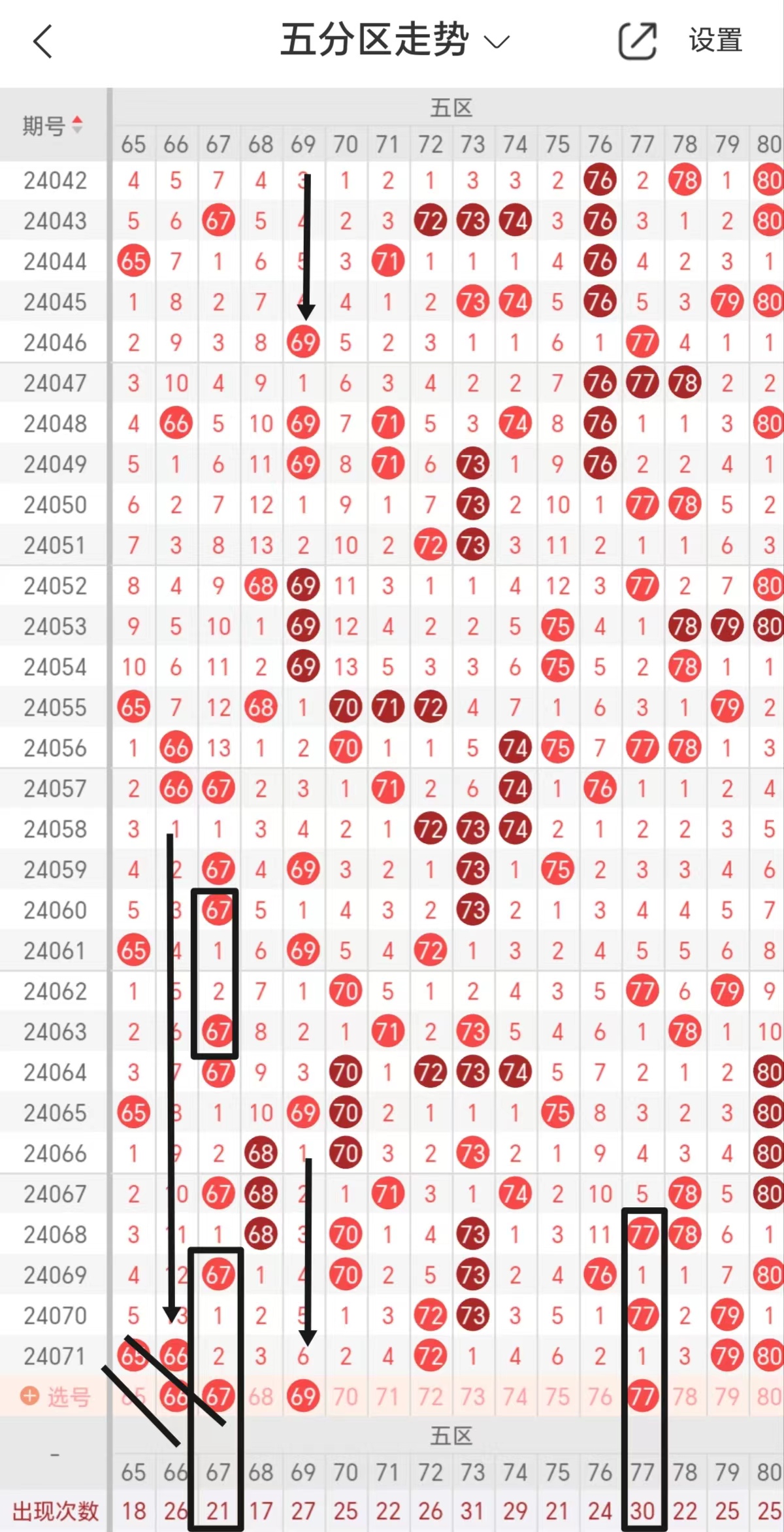 上期共开出5个号码,其中孤码2个、重码2个、斜连码1个。近期该区间出号持续升温,上期出号5个继续走热,本期直线降温的可能性依然较大,但从该区间的出号形态看,本期考虑2至3个号码为宜,从冷热号码分布看,该区间出现次数较少和较多号码均较多,本期考虑出现次数21至30次的号码为主,从出号位置看,本期靠前靠后位置出号的概率较大。根据号码变化趋势,本期该区间考虑4个号码,关注孤码2个(69号、77号),重码1个(66号)、斜连码1个(67号)。