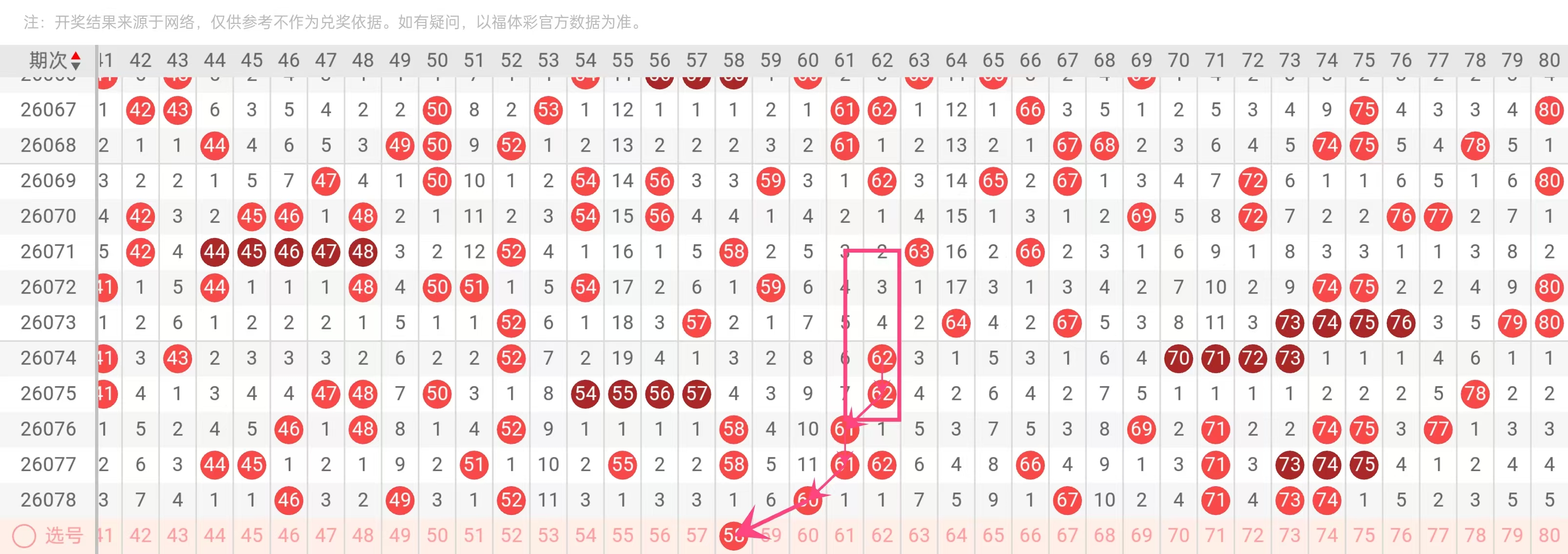 58在近30期中出现9次,位居全部号码的第4位(仅次于75的14次、21的12次、62的10次)。值得注意的是,58的分布非常均匀:几乎每隔2-3期就会出现一次,最长间隔不超过5期(最近一次间隔为4期,从2026070到2026074)。在近10期中,58出现了4次(2026068、2026072、2026075、2026077),保持稳定的出镜率。此外,58属于大号区(51-60),该区间在近30期中共开出约108个号码,平均每期3.6个,是四个区间(1-20,21-40,41-60,61-80)中活跃度最高的区间,占比27%。58的尾数8与08形成“同尾呼应”,同尾号码在选二策略中常被用来捕捉“尾数重复”现象——据统计,近30期中有18期至少出现一对同尾号码,概率高达60%。
