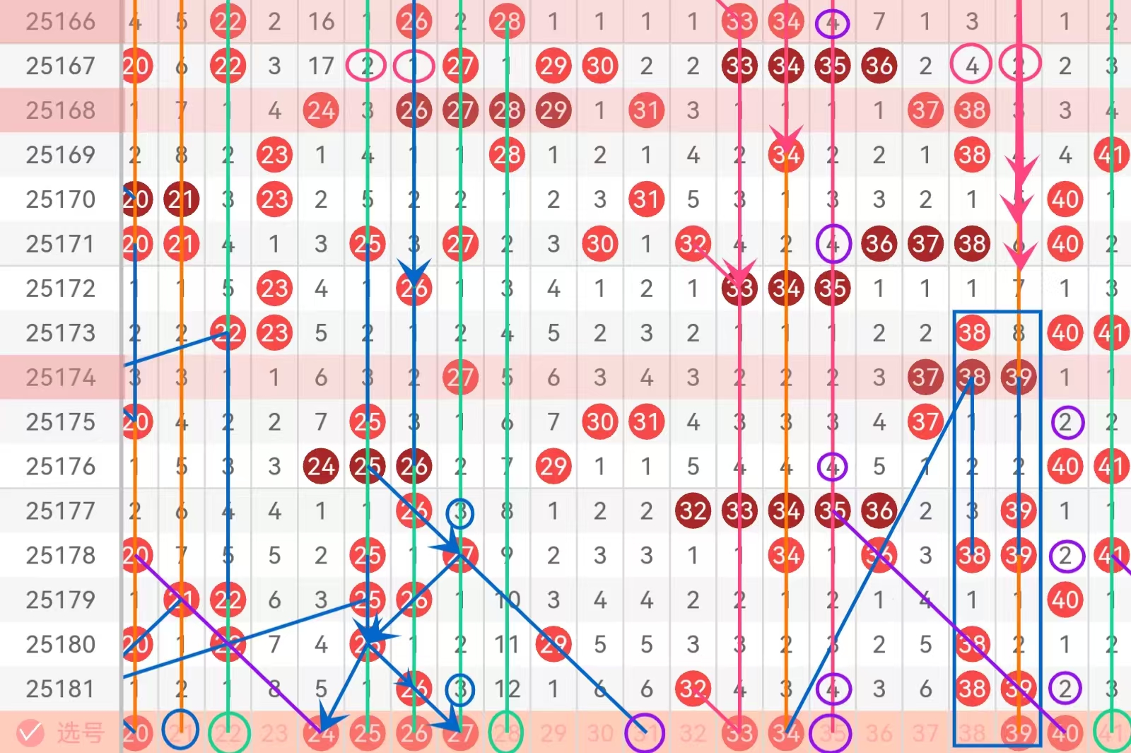二区间上期开出了4个号码球,保持了上期一致;25是一个多重漏一点位,热点推荐胆码,24 25二择一我选择了25主做,24主防;27完美斜连回首的形态点位,上下对称,26 27这里可双码主防做防守复式码,25 26 27三码可拖码选择;33 34 35第三次等距间隔4期出现,三连同位等距三期还是比较少见的,所以这里最大最多拿2码主做,推荐33 34同尾跟随高数据 码,35主防即可;39高数据,本期看重可主做,一个同尾跟随高数据码,;40这个形态码是丢不掉的,可主防,39 40可同做连号复式码;
