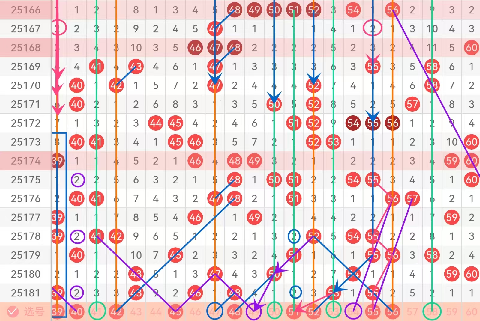 三区间上期出了6个号码球;42 44热态转温冷走势,本期的41 42可二择一主做,同位遗漏3期,推荐做42这个双重分边码;45是一个大明号,九哥本期看好4字头的258同路,所以推荐做45主防49的二择一;47梅花高数据码,本期可主做一手,带上48做42 45 47 48同路带连的思路主防;50 51均有落位关系,放拖码主防吧;52高数据的四码斜连,本期的三个四码斜连点位,52是现在之一,可主做;55热点推荐胆码。高数据码,上下对称,55 56推荐55主做,56主防,55 56可连号复式码;57 58 59 60九哥本期没看好落球点位;万一要看就拿58做防,做52 55 58同路,所以三区间4头5头都以258同路主防或主做的思路;