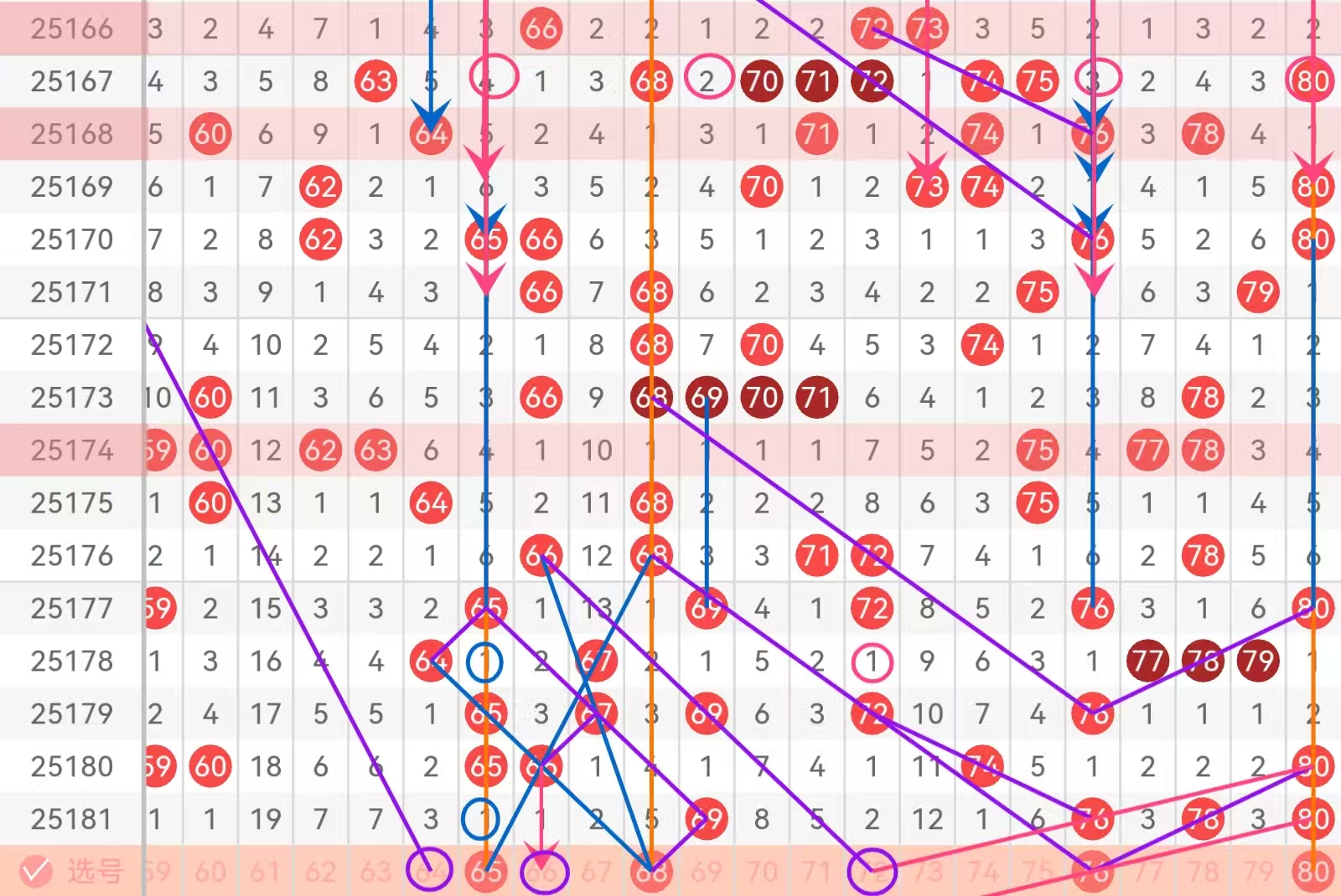 四区间上期开出了4个号码球 ;61 62 63的大遗漏61本期可主防;64是一个隔期分边码,主要是本期九哥看好65的上下对称高数据,同尾跟随高数据码的号码球,所以这里选择64 65连号主防,65主做的思路推荐;68点位形态码,上期就直播间讲了如果69落球,本期68可主做;73 是一个孤码隔期分边,也是7字头最大遗漏值号码球,本期同尾跟随高数据号码,隔2期的四码斜连点位,所以这里的72 73九哥推荐73主做,72 73连号主防;76热点推荐胆码,同尾跟随多数据号码球,也是一个阶梯布局码,本期孤码走重可主做或主防;凤尾的80本期高数据,同尾跟随高数据,所以01 80推荐80主做,01梅花做防;66 78这两个走势码,区间可主防做号;