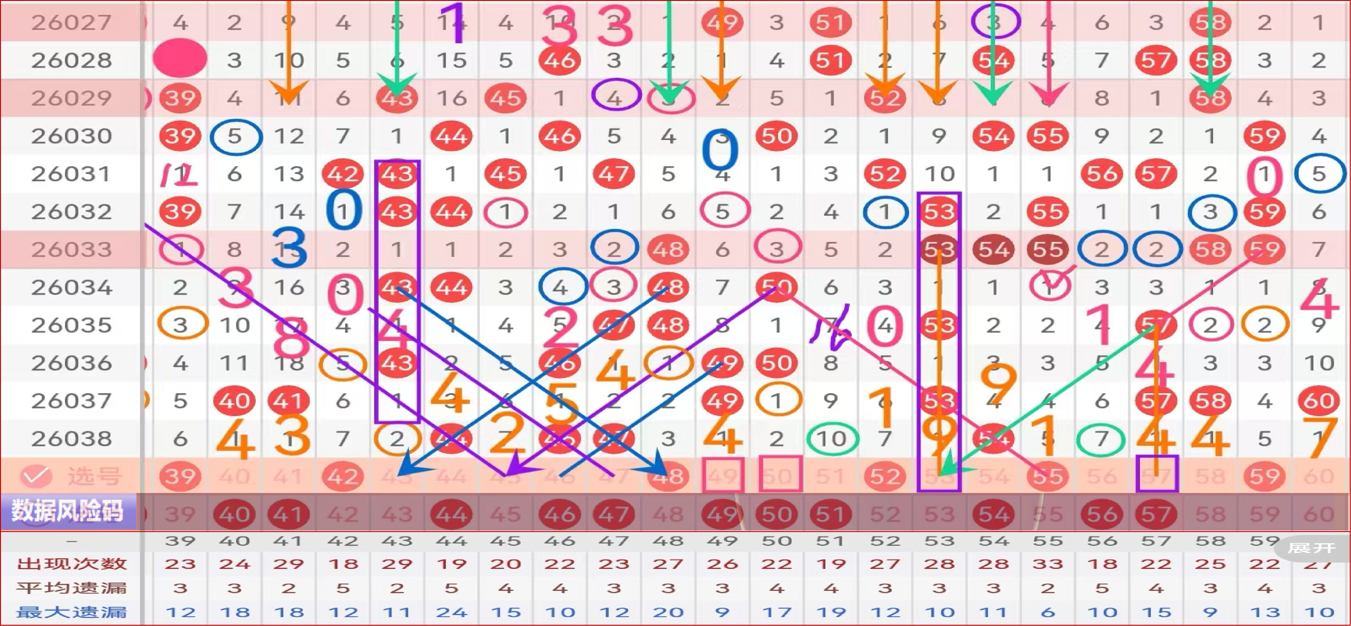 三区间推荐主做号码:42 48 51 52 55 59 防守号码:43 45 58 60;