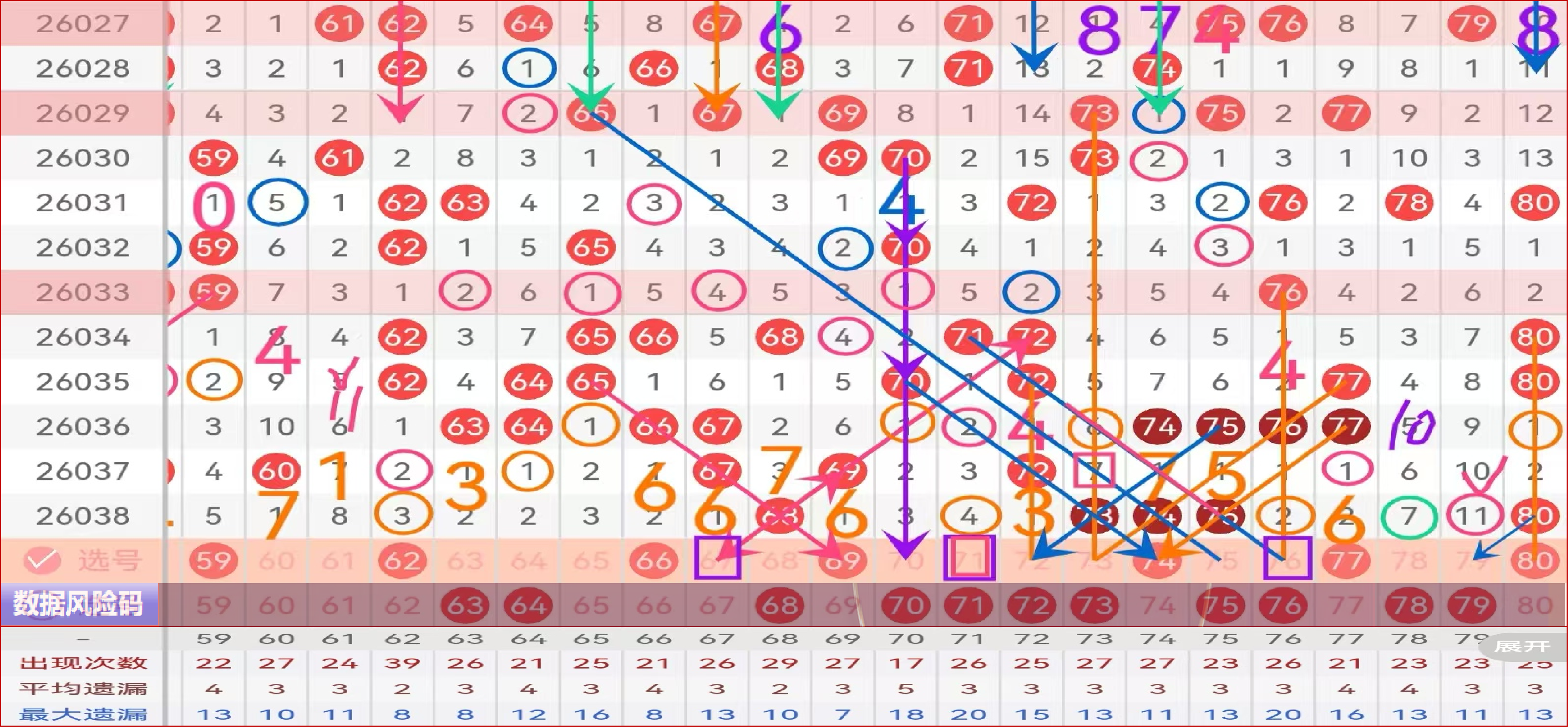 四区间上期开出了5个号码球,均值开出;61是不可放弃的复式码;62高数据,第四次走遗漏3,可主做;65 66二择一推荐66,65小防;5斜连的69,第七次走遗漏1,69可连续两期做号;区间中部的70-73观察是宜;三连73 74 75下面,三择一推荐74走重主做或主防;7字头中部的77,第七次走遗漏2点位,可考虑遗漏属性主防;尾部80可主做或主防走重;