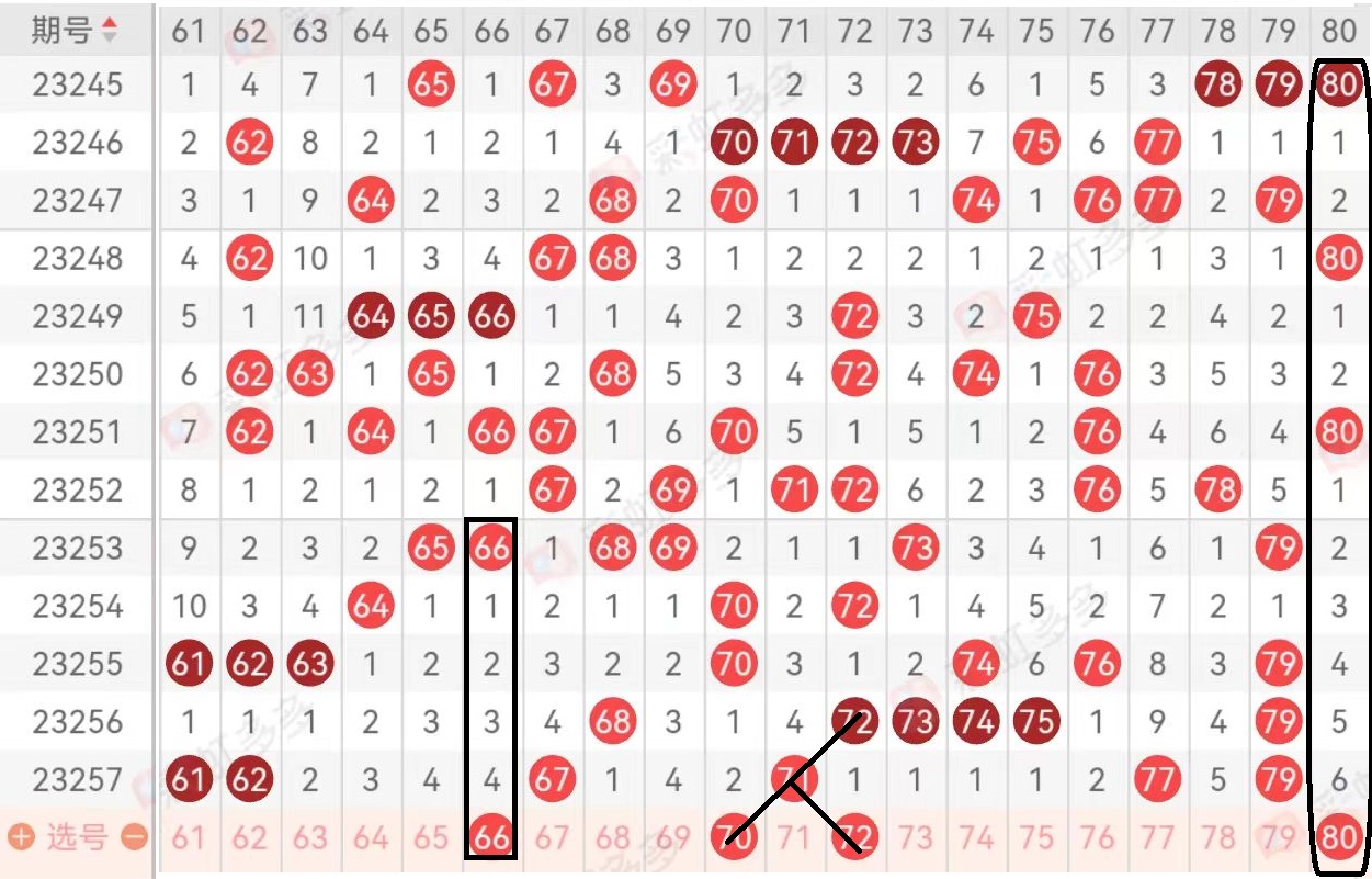 上期第四区间开出了(61 62 67 71 77 79)六个号码球。第四区间上期六码落位,区间落位数量继续走出爆热,那么在四区间连续的走热大背景下上期再次走热也是预料之外,在区间整体判断上出现失误。我们在对四区间上期落号进行研究时思路出现了偏差,但也研判到61-62-67-77四个号码球。那么通过对整个区间号码的研判我们可以看到,在对区域号码进行整体攻防时一定要考虑到来自大盘的影响,尤其是和冷区的对应关联,通过对四区间近期的表现及其落位来看本期我们在区间做号时依然要把重点放在冷态号码上,避免追高落空风险。