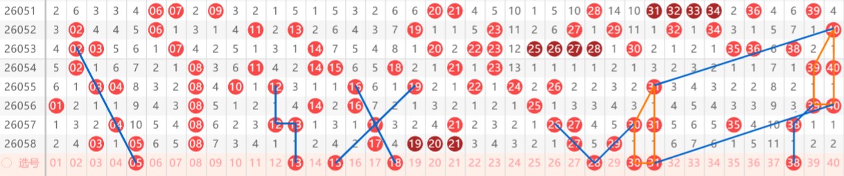 【第一区间1-40】上期开出9个号码。本期分析推荐:05-13-15-18-28-30-31-38八个号码。05斜连四期号码,作为0头258尾重号补充形态号;13为正“L”转倒“L”形态号码,大家注意观察,近期这种形态常见开出,如53期--57期03和04就是此形态号码;15斜连号码,作为区间同尾出号形态考虑;18斜连转斜连号码,同时具有重号斜连趋势;28大“V”形态号码,同时是完整的上下对称大“V”形态,看胆;30-31形态与39-40同形态;38形态号码(如图),主要看遗漏一期出号。区间推荐重点号码:一小区间13-15-18,二小区间28-30-31。