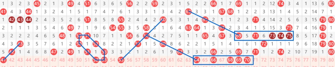 【第二区间41-80】:上期开出11个号码。本期推荐:41-52-53-55-64-66-68-69-70九个号码。41斜连码,看与38搭配出号;52-53主要看“子弹头”完美形态;55同路号码,与52-53形成间接四连趋势;64-66-68-69-70与右上方奇数斜连转当期奇数连号如出一辙,形态完全相同,不妨抓一手。区间推荐重点号码:三小区间52-53-55,四小区间64-66-68。