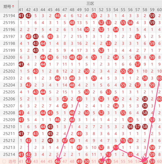 三区间在近期的走势上分析,上期三区间开出了5码,而且整体区间还是温冷形态走势,上期三区间开出的形态是隔期回补和斜连号走势,那么本期我们要注意防守短期回补上开出2-3码机会,而重码上防守42.53.59中开出一码机会,至于斜连号下拉位置上注意防守52号开出机会,如图所示。