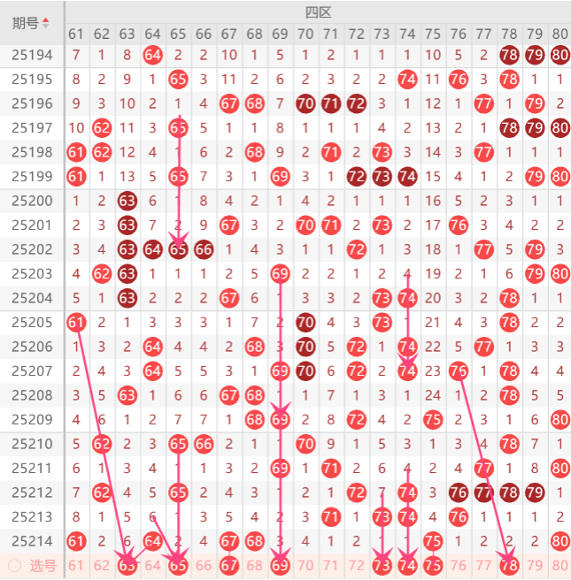 四区在近期的走势上来判断机会的话,整体区间上开始走热形态,上期四区间开出了6码,而上期区间开出的形态是孤码分边和空位回补走势,那本期四区间的重码上注意67.75中参考一码开出机会,而孤码分边上注意防守63.65中开出机会,而斜连号下拉位置上注意防守74号开出一码机会,至于对称形态的65.69.72.74.中开出一码机会,如图所示。