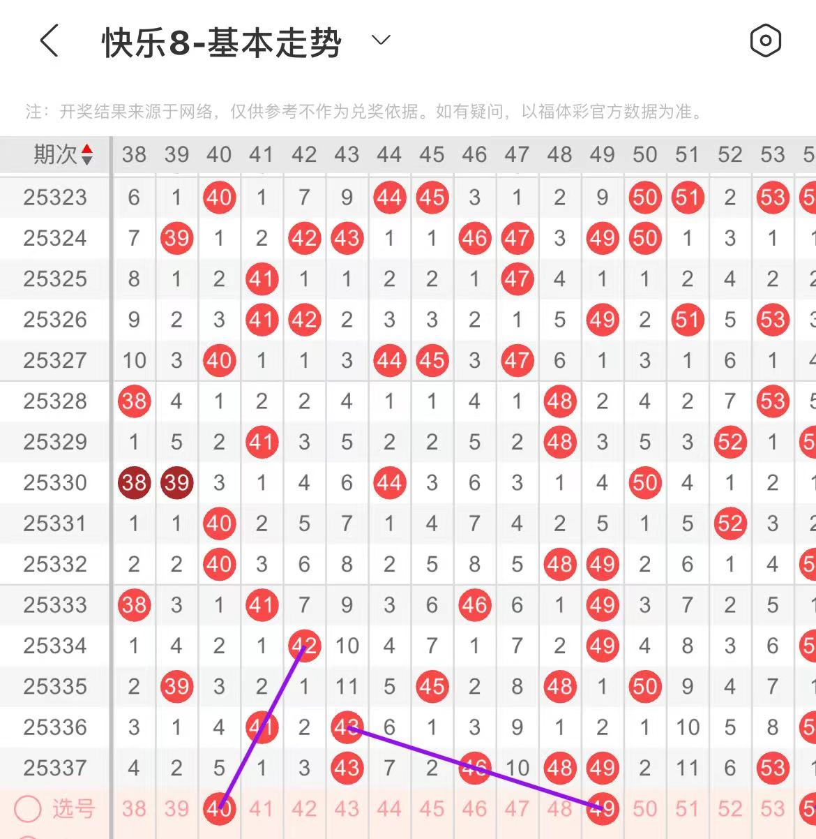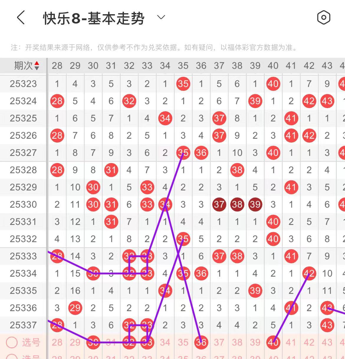 31-40区:本区间上期开出了两个号码,从号码走势图上看,该区出号个数有一定的规律性,本期注意出号个数有增加的可能,出号个数在三个号码左右。有出号走势的号有33号,斜连出号走势,防32.33同出的可能,36.40号,均有斜连出号走势。
